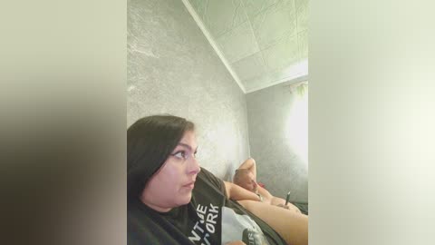 Video of a pale woman with long black hair in a black t-shirt, sitting in a dimly lit room with textured walls and a window emitting light, looking introspective.