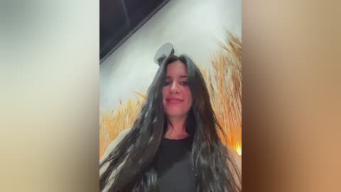 Video of a woman with long, straight black hair and a silver hairpiece resembling a helmet. She has a neutral expression. Background features a wall mural of a sunset over wheat fields.