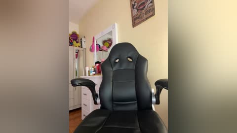 Video of a cozy, well-lit room featuring a black gaming chair, a white dresser with toys and makeup, and a wall-mounted mirror. The background includes a vintage poster and light yellow walls.