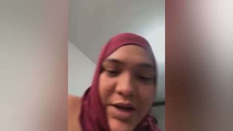 A blurred video of a young Black woman with medium brown skin, wearing a red hijab, smiling with closed eyes, set against a plain white wall background.