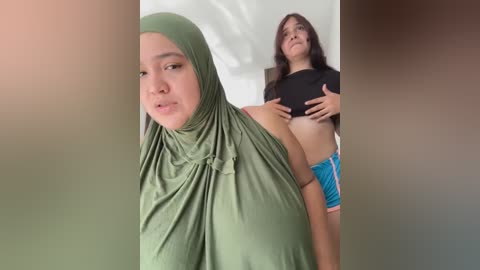 Video of two women; one in a green hijab, the other in a black crop top and blue shorts, both smiling in a bright, indoor setting.