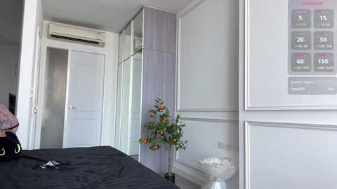Video of a minimalist, modern bedroom with a black bed, white door, air conditioner, white wall, and a digital thermostat.