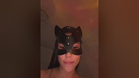 Video of a woman wearing a black cat mask with metal studs, long black hair, and a subtle smile, against a blurred background with warm lighting.